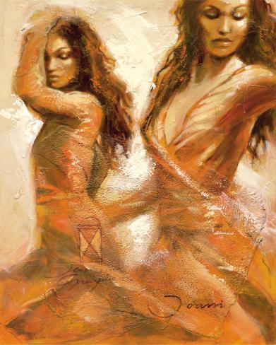 As seen in one of his pieces, “Beauties in Motion,” there are two women that seem to be dancing; you can see the flow of the fabric creating the skirt of their dresses. The two women look very similar; it could be viewed as the same woman just moving around the canvas. The emotion on the women’s faces can read as being sensual or seductive which Joani likes to portray within his works as well. “ “Passion of Dance,” depicts a man and a woman with a Latin sort of flair, bright colors, dancing passionately. The man is shown dipping the woman, holding her body as she arches back. The bottom of the piece fades in a way and the two are surrounded by a “passionate red.”